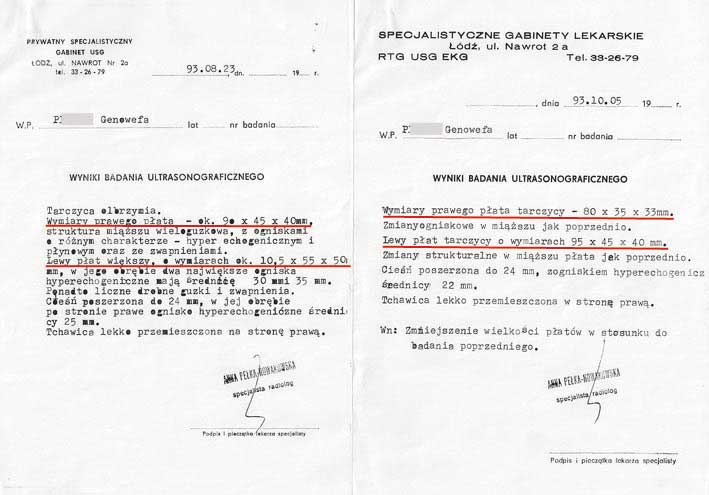 USG z dnia 5.10.1993: „Wymiary prawego płata – 80x35x33 mm, lewy płat tarczycy – 95x45x40 mm”.